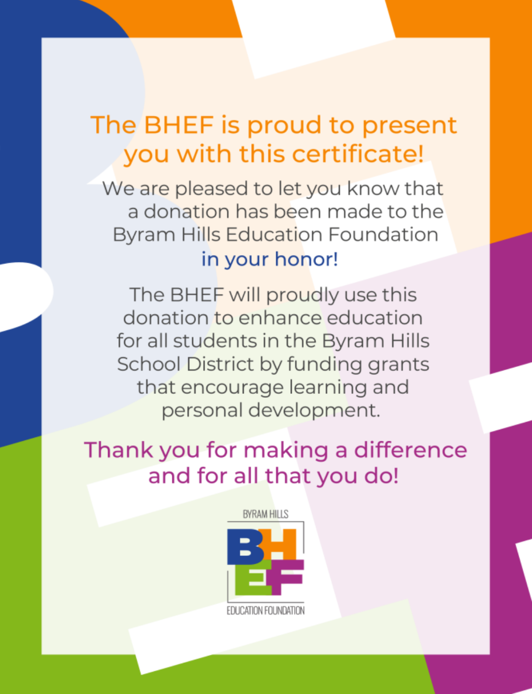 Make a gift to the BHEF in honor of a teacher! Your teacher will receive an email and special certificate letting them know of your honorary gift. *NEW* Teacher Tributes will help fund insta-grants that directly support teachers. Your gift will mean so much to them! If you wish to honor multiple teachers, simply complete one form per teacher.